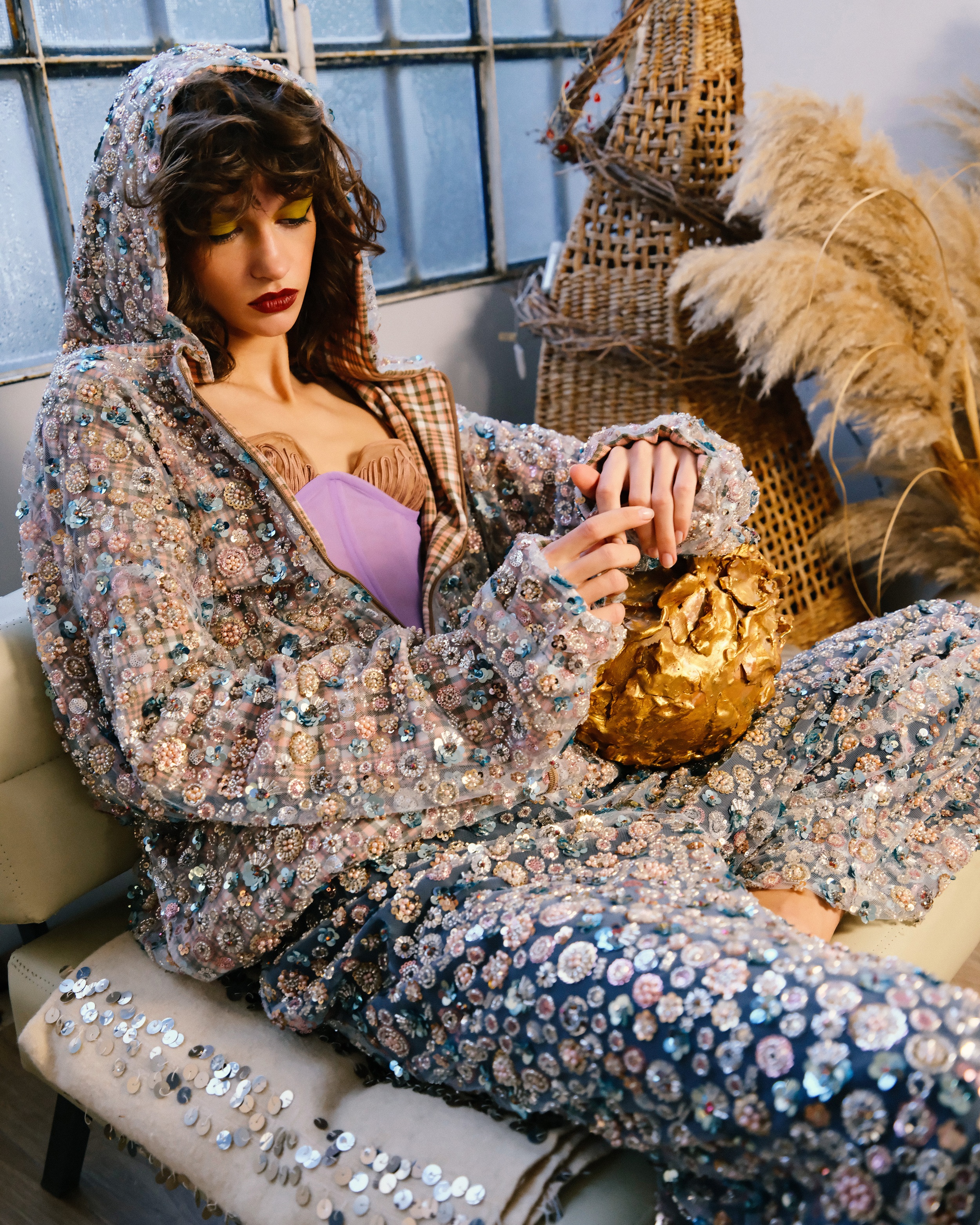 Plašč: Pomandère, krilo: Simon Cracker, krilo z našitki: Sara Wong, zapestnice in prstan: Atelier Ortica, salonarji: Santoni, umetnina: Elisa Pini