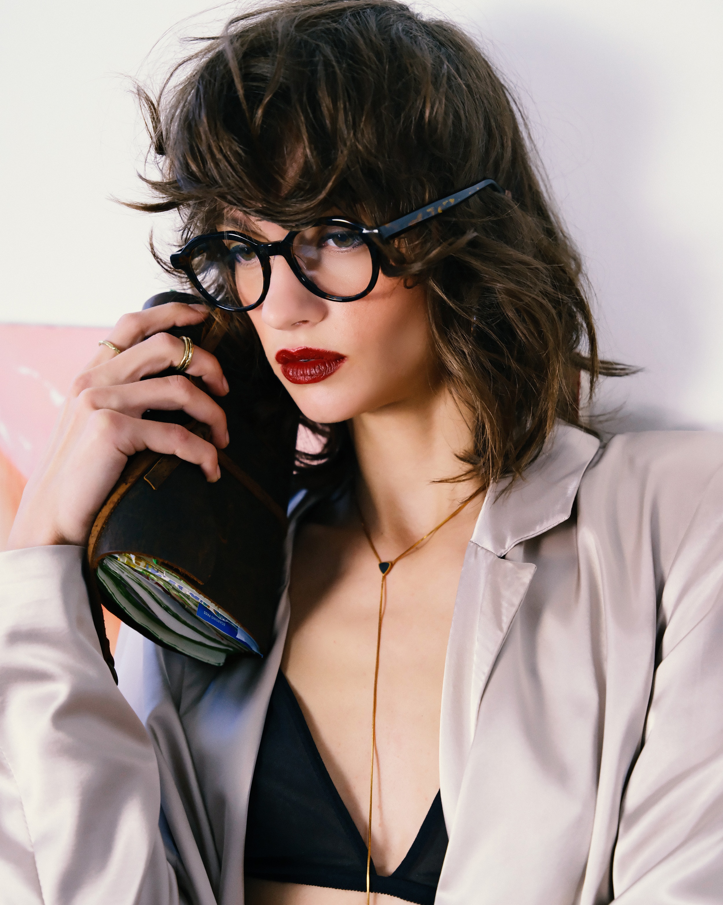 Obleka in očala: Romeo Gigli, modrček: The Room Of Colors Milan (arhiv), prstani: Belleke Gioielli, ogrlica: 12pm Jewelry, umetnina: Elisa Pini