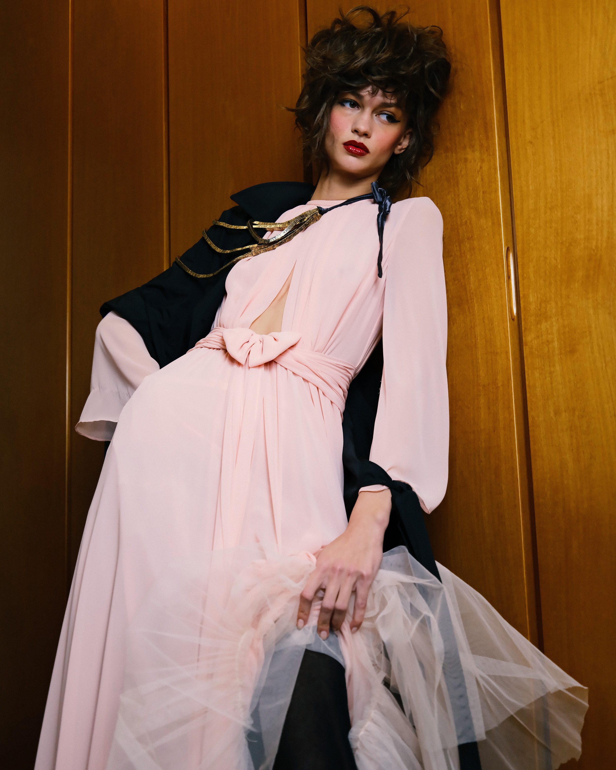 Obleka: Stefano De Lellis, ogrlica, krilo in ogrinjalo: Meimeij, rožnato krilo: Cettina Bucca