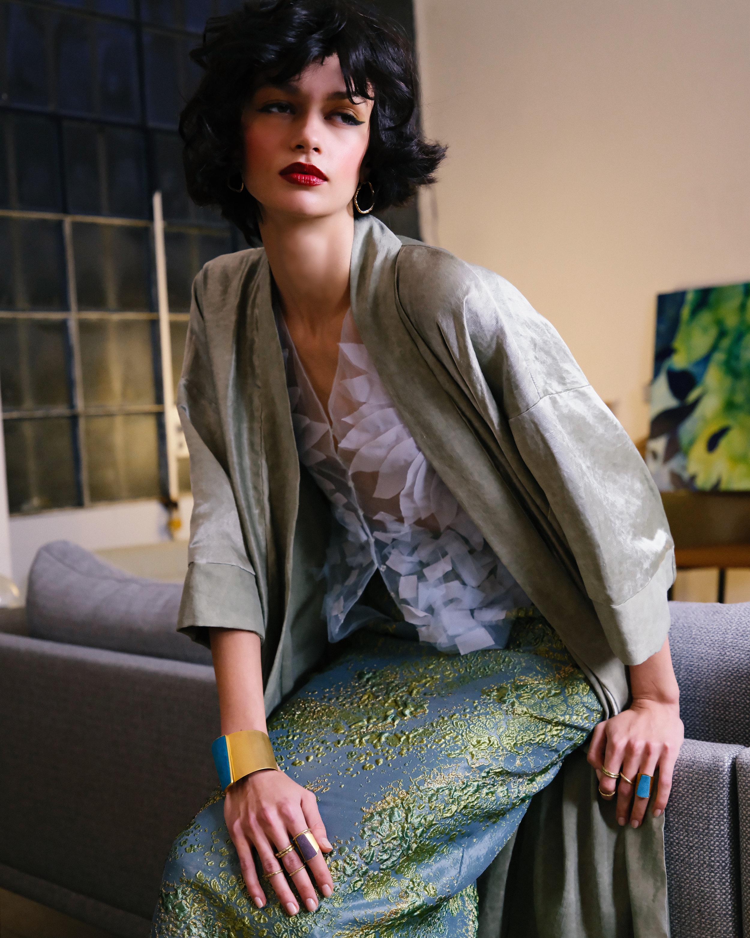 Plašč: Art 259 Design, top: Amelia, krilo: Barbara Rizzi Atelier, uhani: Atelier Ortica, zapestnice in prstani: 12pm Jewelry, prstani: Belleke