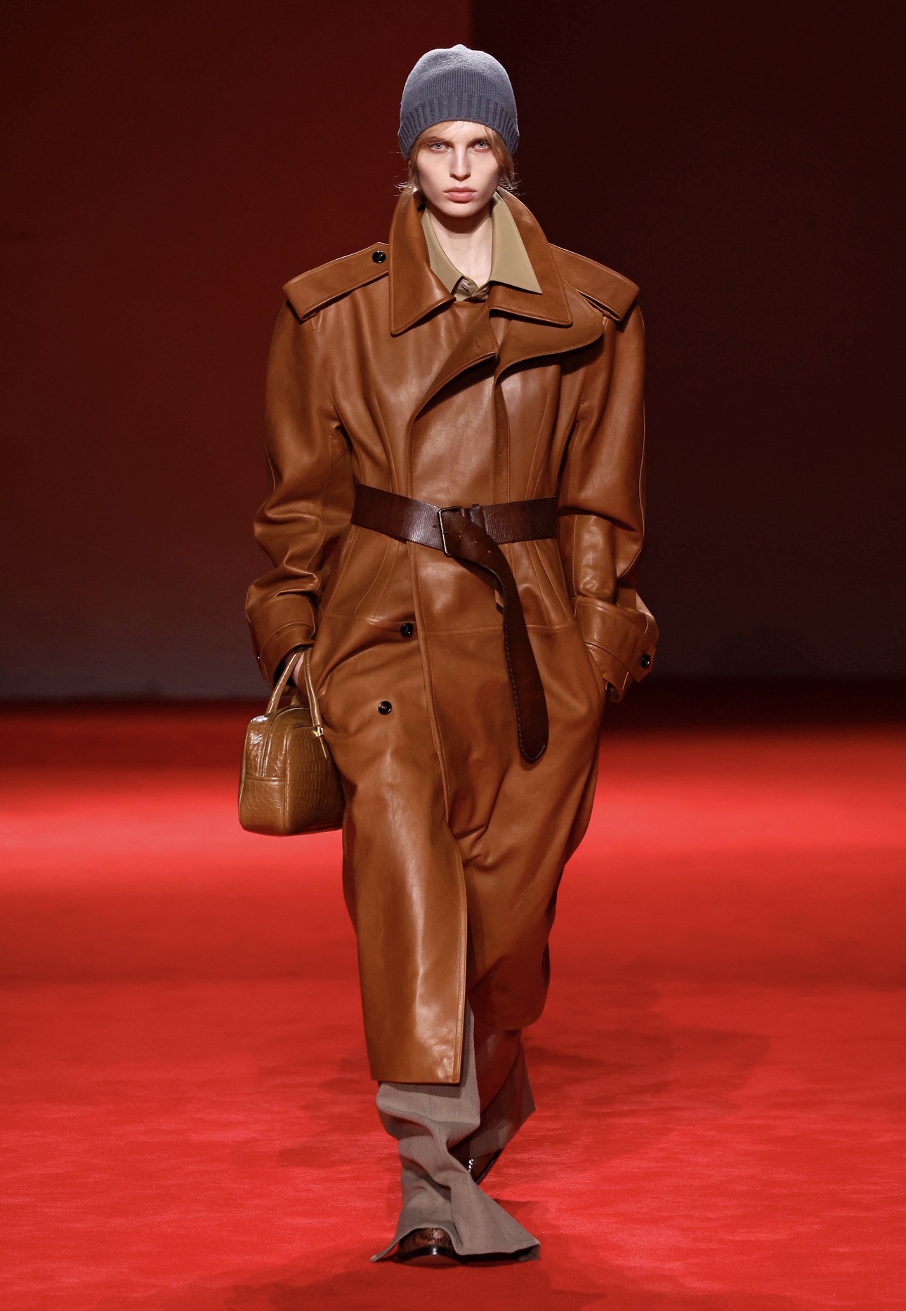 Siluete so bile izrazite, vendar brez agresivnosti. Plašči z zaobljenimi rameni, sproščene obleke brez rokavov z velikimi funkcionalnimi žepi ter midi krila v nežnih kremnih tonih so zaznamovali kolekcijo z mehkejšimi robovi in ukrivljenimi šivi. Tudi klasični sivi volneni plašči in usnjeni kosi so izgubili strogo ostrino ter dobili bolj tekočo, zaokroženo obliko. Ikonični intrecciato, zaščitni znak hiše, je ostal v ospredju – pletene usnjene torbe so se pojavile v novih interpretacijah, bodisi stisnjene z retro kovinsko zaponko bodisi povečane v predimenzionirane tote modele. Polmesečaste torbice in srebrne ogrlice z organsko deformirano verižico so dodatno poudarile ravnotežje med konceptualnim pristopom in komercialno privlačnostjo ter spomnile, da beseda »bottega« v italijanščini pomeni trgovina – prostor, kjer se umetnost sreča z nosljivostjo.
