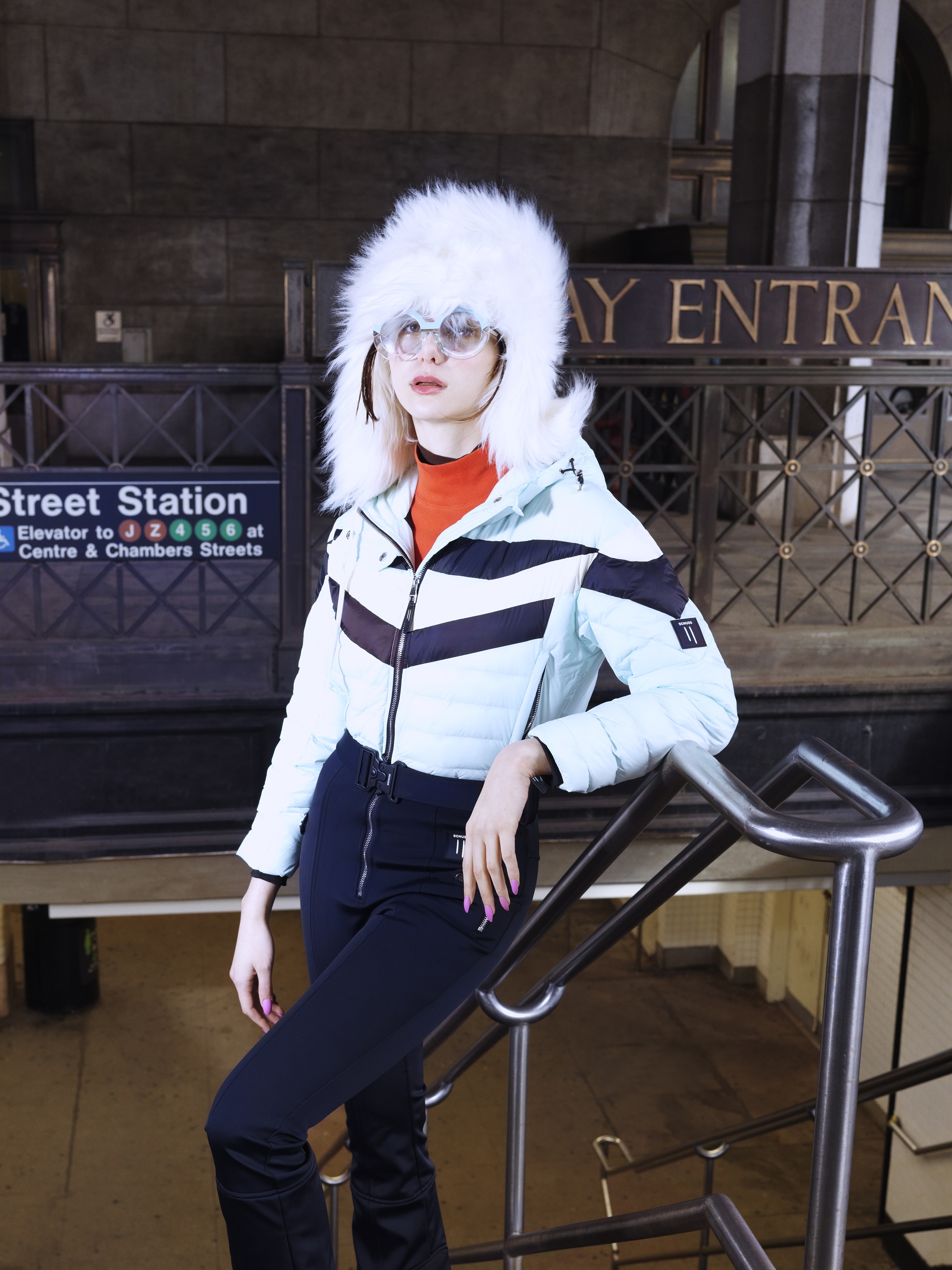 Smučarski kombinezon: SCHUSS APPAREL (@schuss.apparel), sončna očala: HAUTELIFE WORLD (@hautelifeworld)