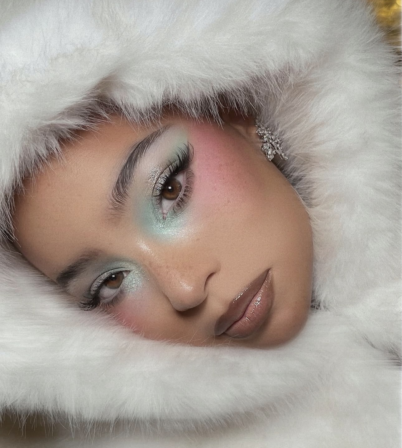 Frosty make-up je prepoznaven po rožnati toplini na licih in nosu, svetlih ali skoraj ledeno belih vekah, posvetljenih obrveh ter obilici bleščic in hladno obarvanega highlighterja. Ključ je v ustvarjanju harmonije med bleščečimi teksturami in naravno svežino kože, da videz deluje čarobno, ne pa kičasto.
