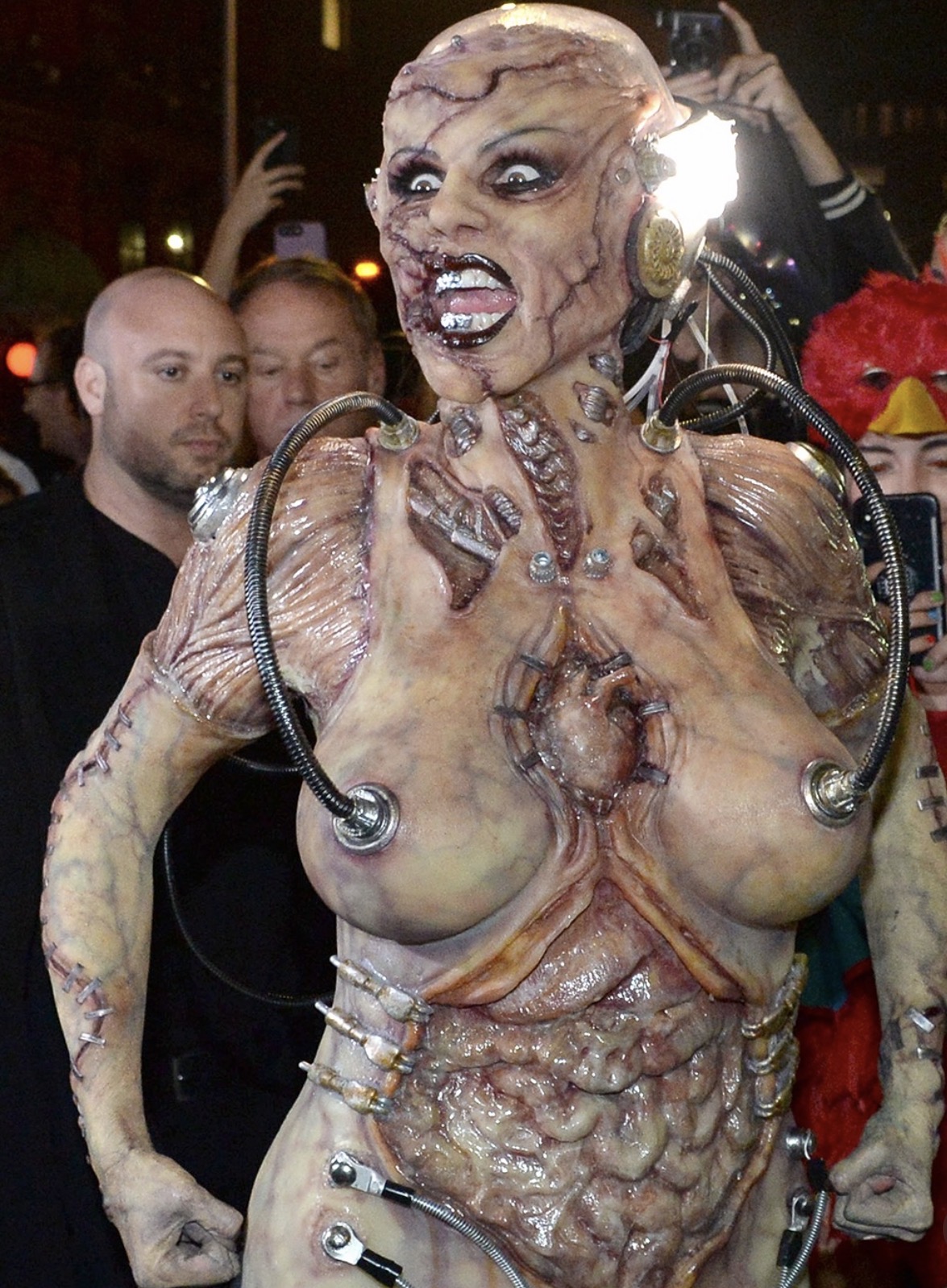 Heidi se je spremenila v pošastno, skoraj groteskno bitje iz znanstvenofantastičnega filma – kombinacijo mesa, kovine in krvi. Kostum je bil fizično naporen, sestavljen iz številnih protetičnih kosov in mehanskih dodatkov. To ni bil več “kostum”, ampak filmska kreacija.