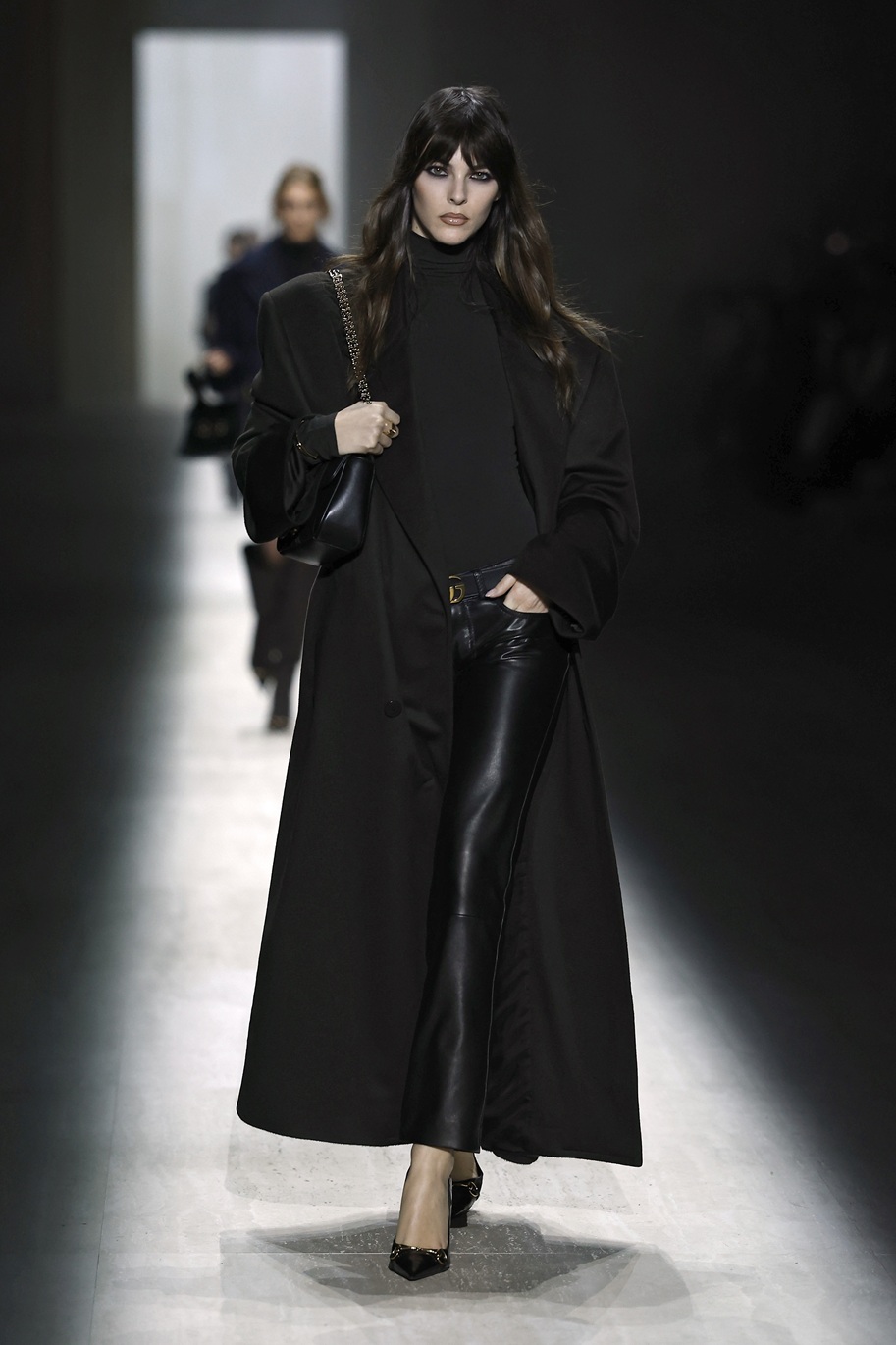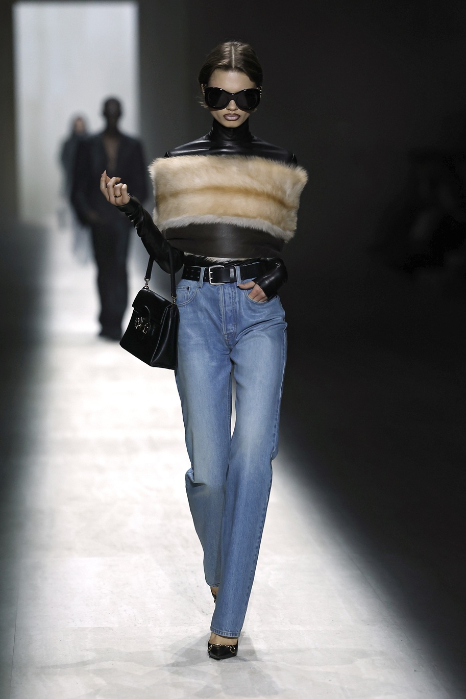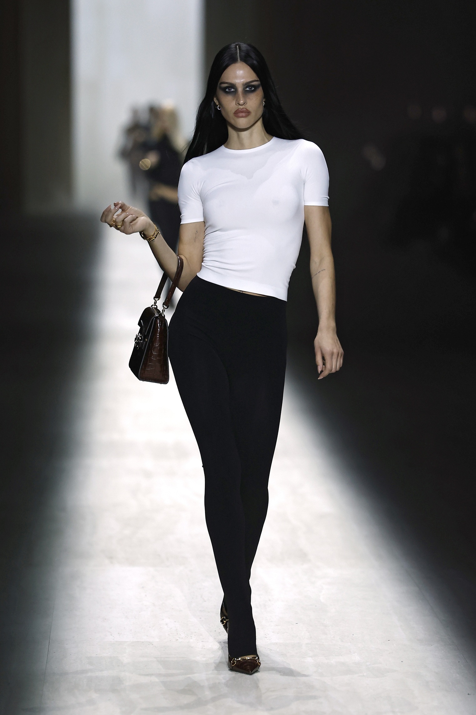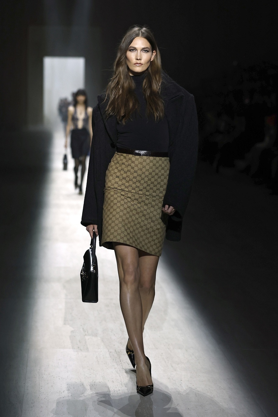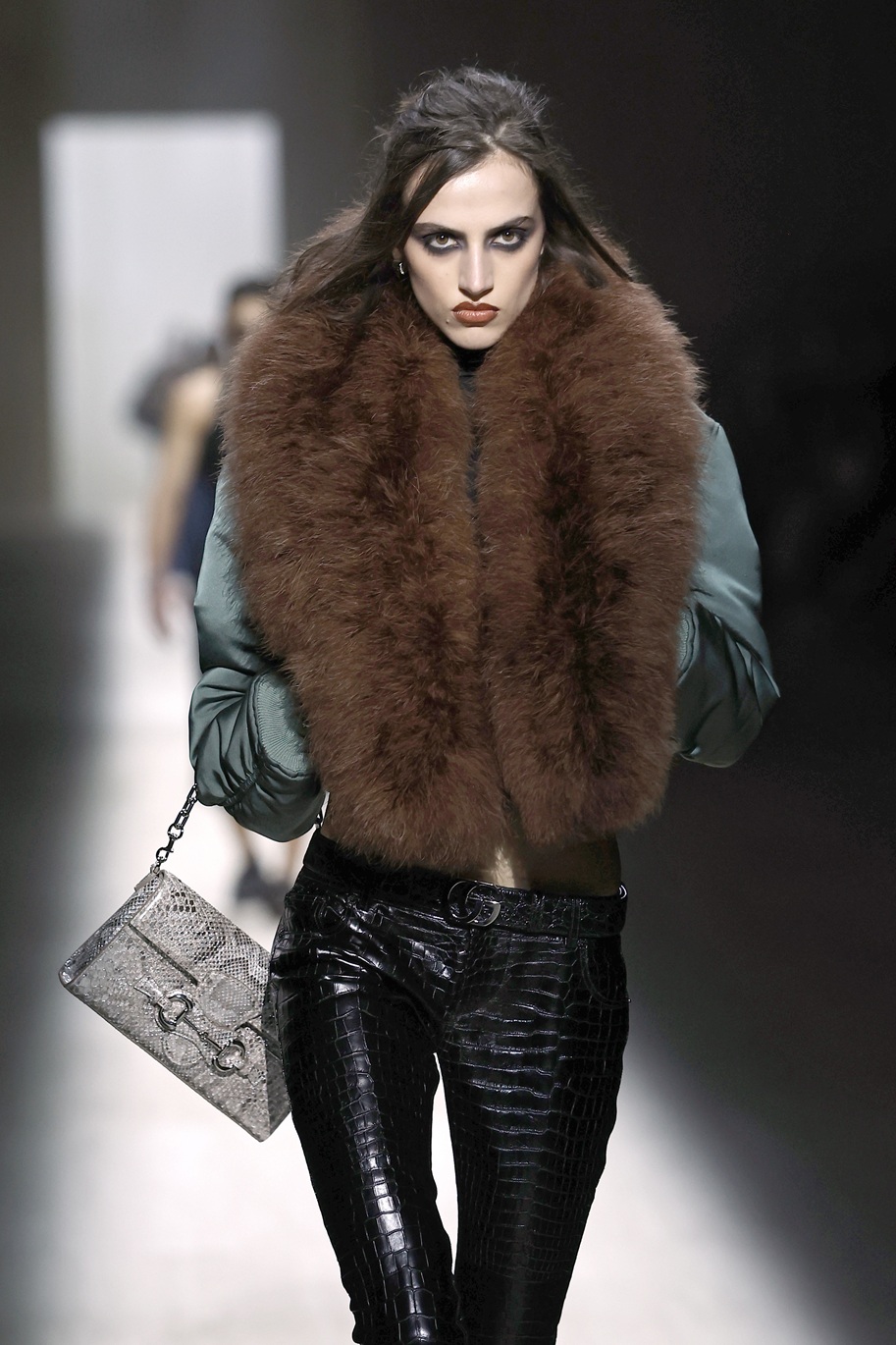 Italijanska manekenka Vittoria Ceretti se je sprehodila po milanski modni pisti v videzu, ki je šel na mejo med žensko za žure in poslovno žensko: črne usnjene hlače, pete, klasičen Guccijev pas, pulover z ovratnikom in črn trenčkot. Njen make-up videz pa se ne more odločiti ali gre na večerno zabavo ali pa je ravno prišel iz prekrokane noči…
