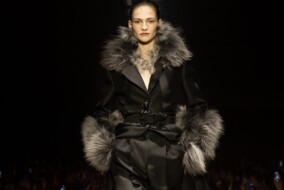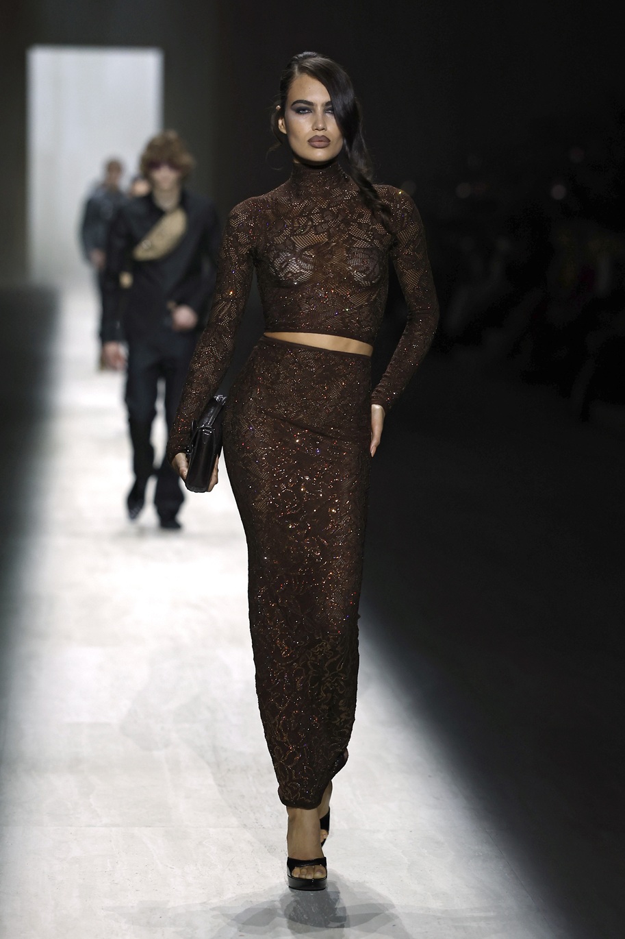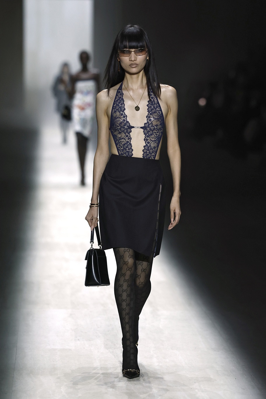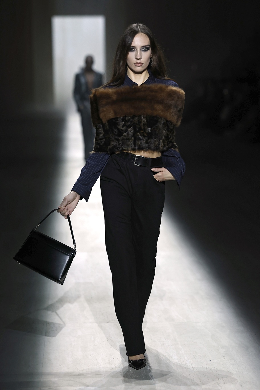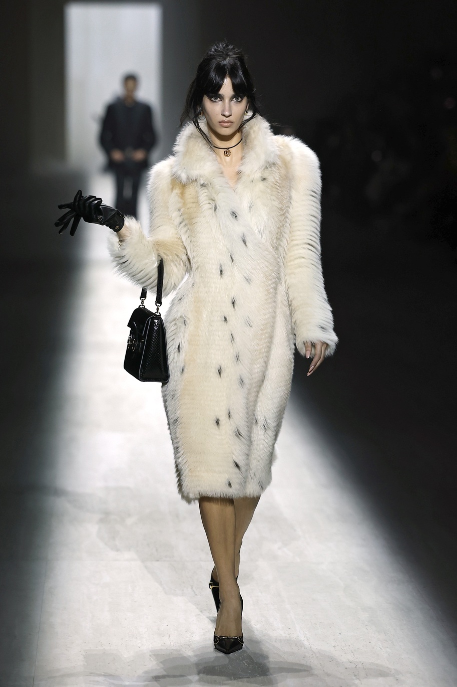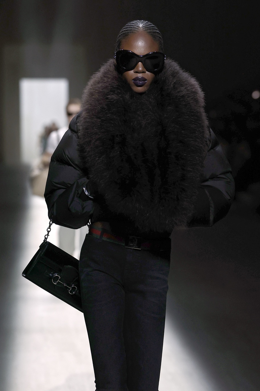 Italijanska manekenka Vittoria Ceretti se je sprehodila po milanski modni pisti v videzu, ki je šel na mejo med žensko za žure in poslovno žensko: črne usnjene hlače, pete, klasičen Guccijev pas, pulover z ovratnikom in črn trenčkot. Njen make-up videz pa se ne more odločiti ali gre na večerno zabavo ali pa je ravno prišel iz prekrokane noči…