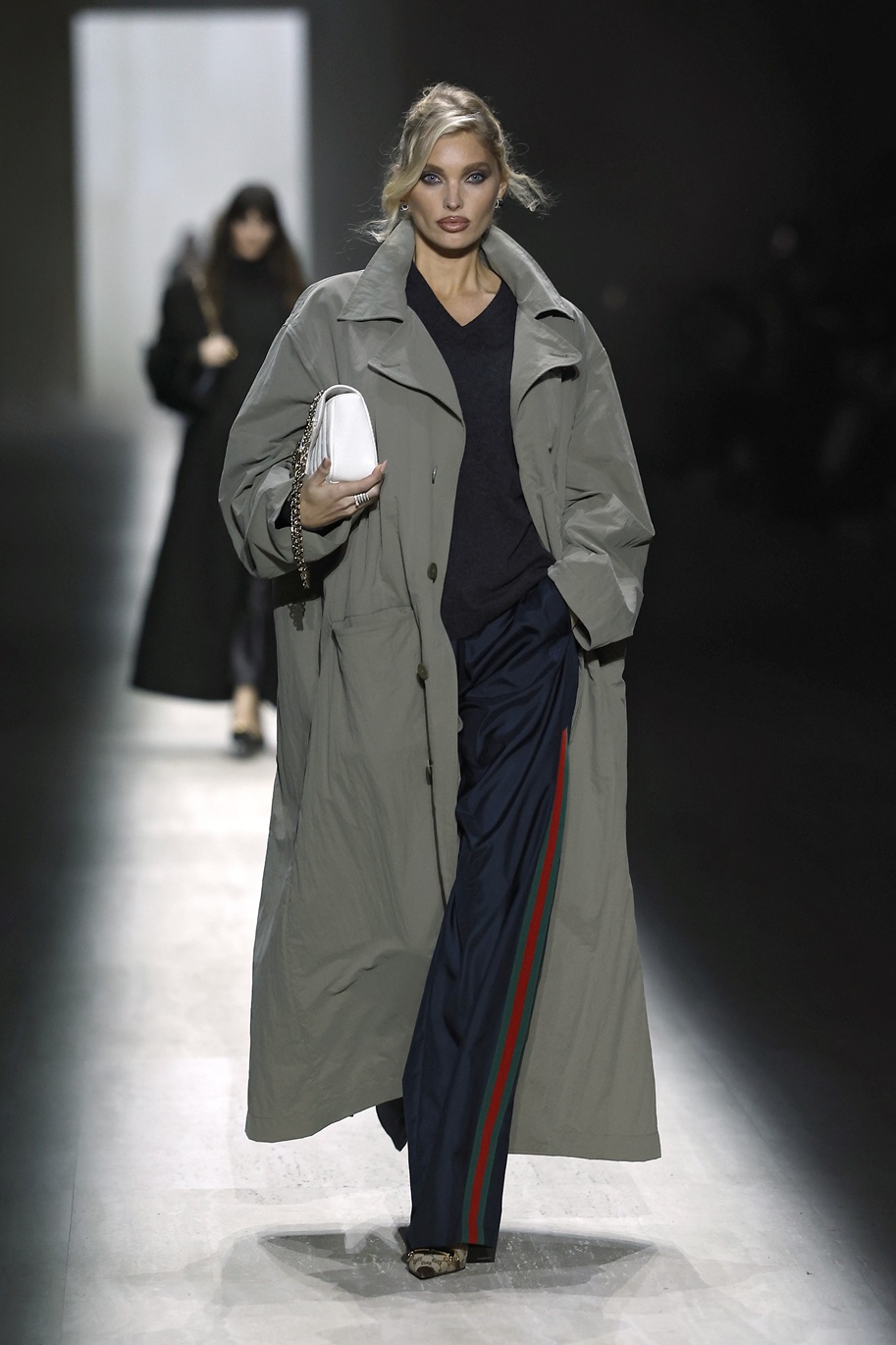 Skandinavski supermodel Elsa Hosk se je sprehodila v Guccijevi različici videza za prosti čas: športne hlače z ikoničnimi črtami, čevlji z nizko peto, siv pulover z V-izrezom in oversized trenčkot.