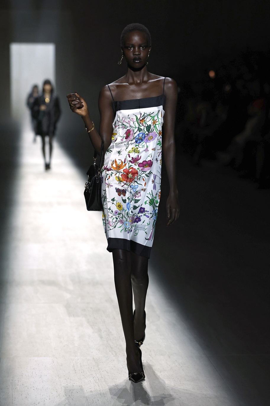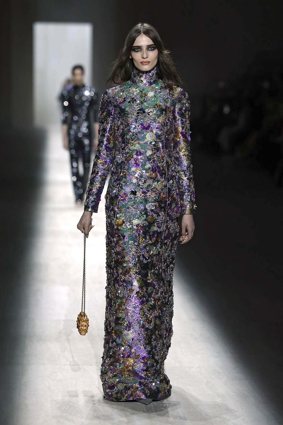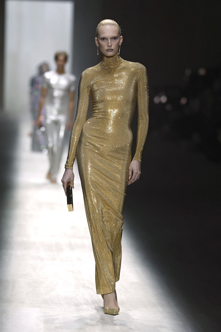 Tudi Alex Consani se je sprehodila po modni pisti v oprijeti obleki – njena pa je bila dolge dolžine, z dolgimi rokavi, ovratnikom in v kovinsko zlati barvi. Seveda pa je bil videz dopolnjen z odlično usklajenimi zlatimi čevlji s platformo.