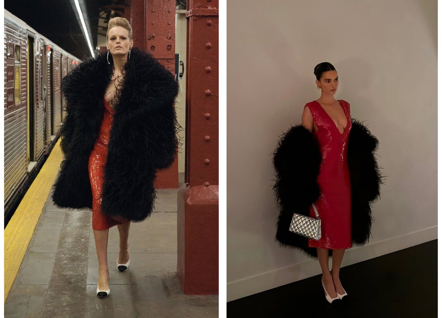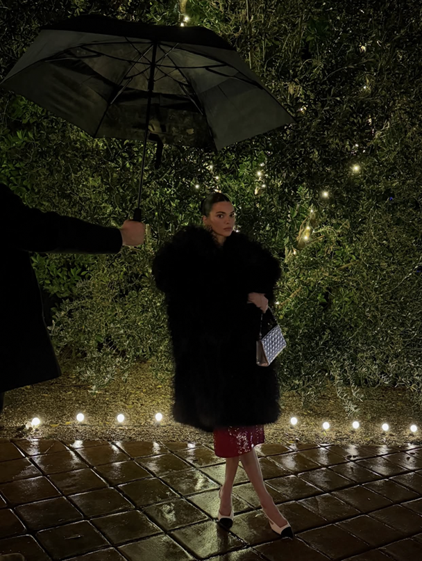 Kasneje se je preoblekla v nekaj bolj Božička kot snežaka in stopila ven v osupljivi rdeči midi obleki z globokim V-izrezom in brezrokavno silhueto. Bleščičasti kos, je bil vzet iz kolekcije Métiers d’Art 2026 Matthieuja Blazyja za Chanel, kjer je hodil po peronu podzemne železnice modna pista s črnim krznenim plaščem in črno-belimi čevlji z zaponko. Poleg teh poudarkov je Jennerjeva obleko kombinirala z vpadljivimi zlatimi čepki in kovinsko srebrno torbo francoske modne hiše. Lase je spela v nazaj počesano figo in bila videti še posebej glamurozno, ko je pozirala za fotografije zunaj v dežju.
