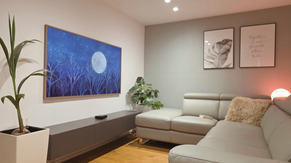Že ob montaži postane jasno, da je zasnovan drugače. Njegova izjemno tanka oblika in skoraj neopazna pritrditev na steno ustvarita vtis, kot da je del arhitekture prostora, ne dodan element. Brez vidnih kablov, brez masivnih robov, brez klasične tehnološke dominance. V trenutku, ko je nameščen, začne delovati kot slika, ki je premišljeno umeščena v prostor, zadržana in elegantna. Večkrat smo se zalotili, da smo ob vstopu v prostor najprej opazili »sliko« in se šele nato spomnili, da gre za televizor.