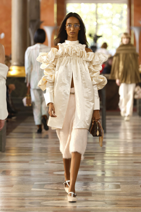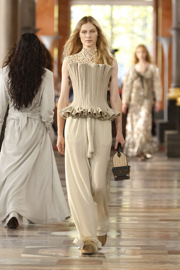 Umetniški direktor ženske mode Nicolas Ghesquière, ki je danes eden najdlje delujočih kreativnih direktorjev v luksuzni modi v času, ko druge hiše menjajo vodilne kreativce, kot sezonski trendi, je Ghesquière modno hišo vodil z neomajnim prepričanjem v moč pripovednega oblačenja. Od srečevanja srednjeveškega oklepa in futurizma križarjenja v Avignonu do nomadske čutnosti prejšnjih sezon so njegove Louis Vuitton linije vedno študije gibanja skozi umetnost potovanja. Toda to sezono gibanje ni bilo geografsko niti potovanje ni bilo dobesedno – bilo je notranje, proti svobodi, zasebnosti in spreminjajočim se mejam identitete.