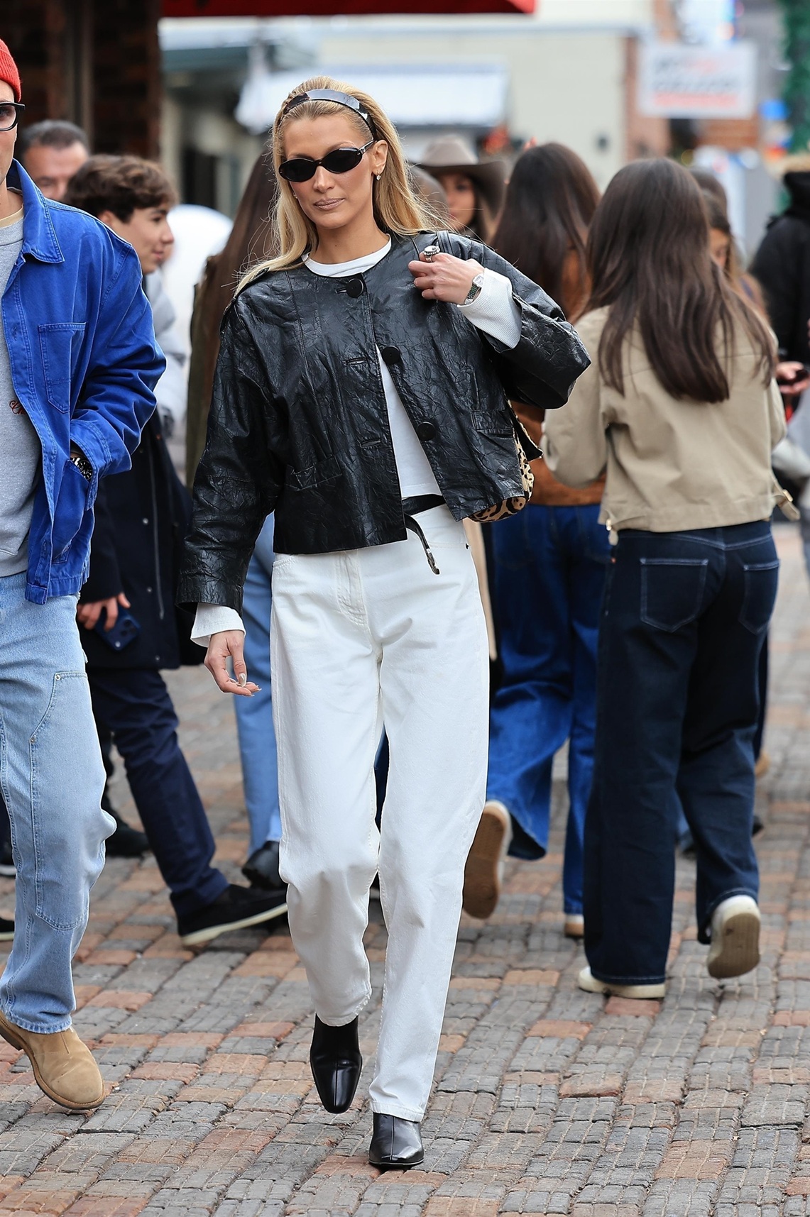 Bello Hadid je izpolnjevala vsa nostalgična modna merila! Potem ko je zadnje dni leta 2025 in prve dni leta 2026 preživela z ostalimi zvezdniki v Aspenu v Koloradu, se je Hadid začela nagibati k svojemu bolj sproščenemu, manekenskemu slogu. Med nakupovanjem s prijatelji je nosila še en videz v slogu Bessette Kennedy, in sicer črno usnjeno jakno brez ovratnika, bele kavbojke in še en bend Alice. Drugi dan se je odločila za preveliko usnjeno jakno, modre kavbojke pa je zatlačila v starinske škornje – kako zelo značilno za generacijo X.