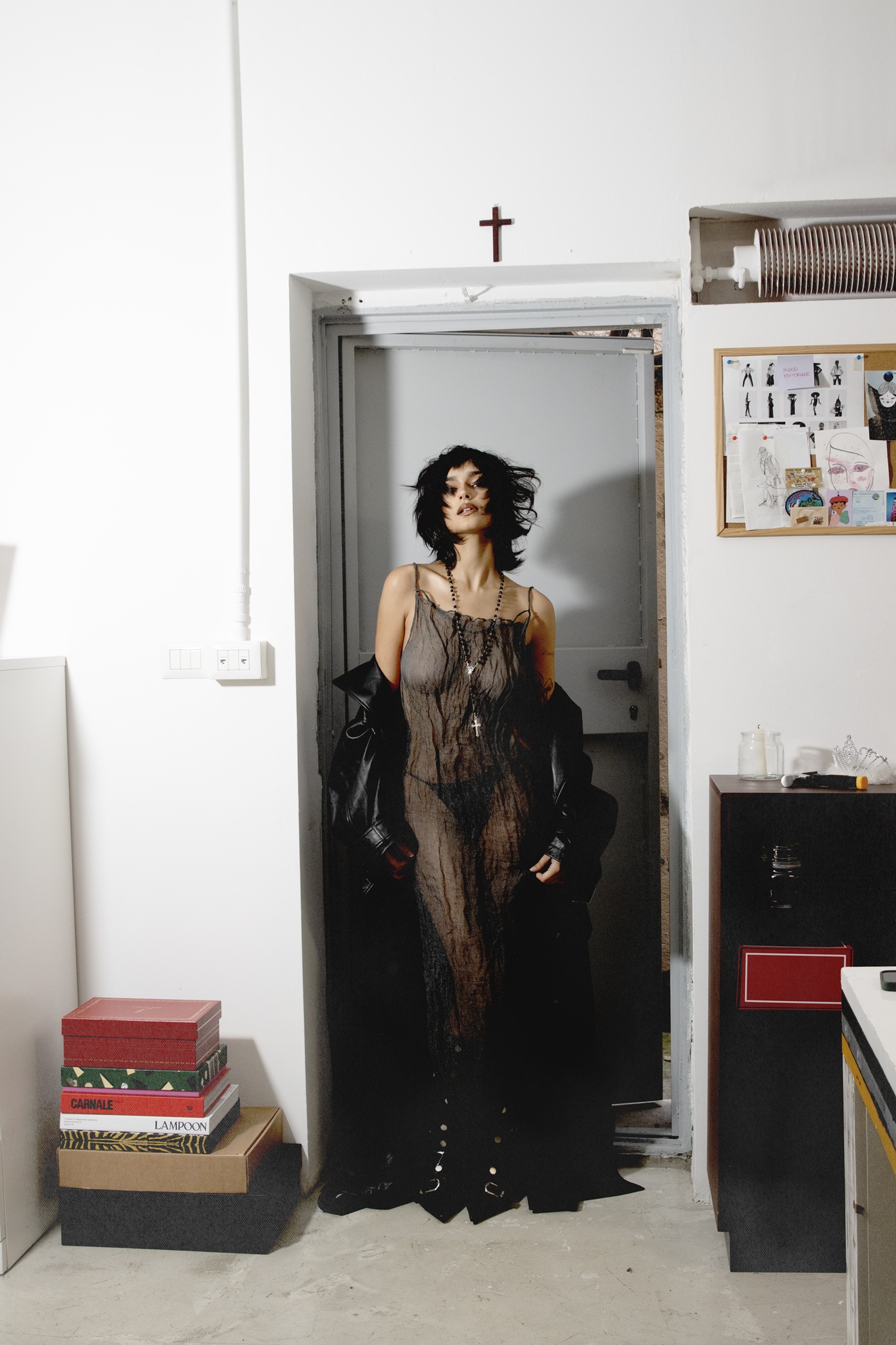 Plašč: Les Filles d’Eva, Obleka: ART259DESIGN, Spodnje perilo: DSQUARED2, Ogrlica: Rosary necklace,