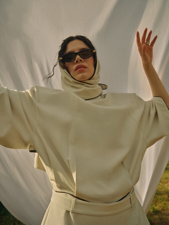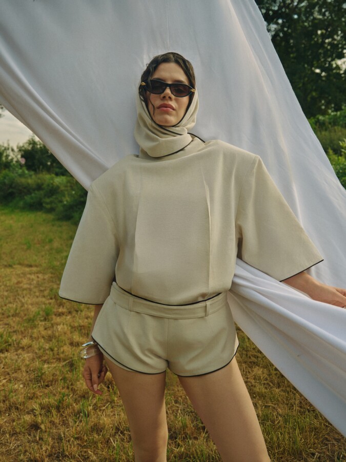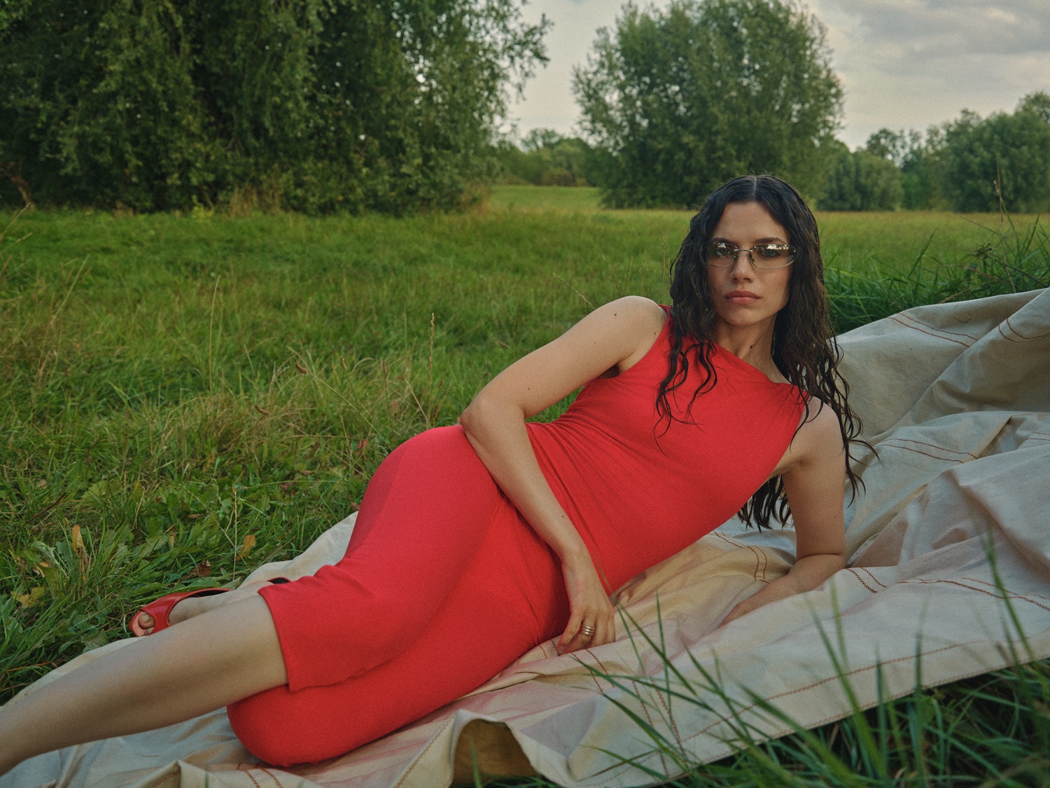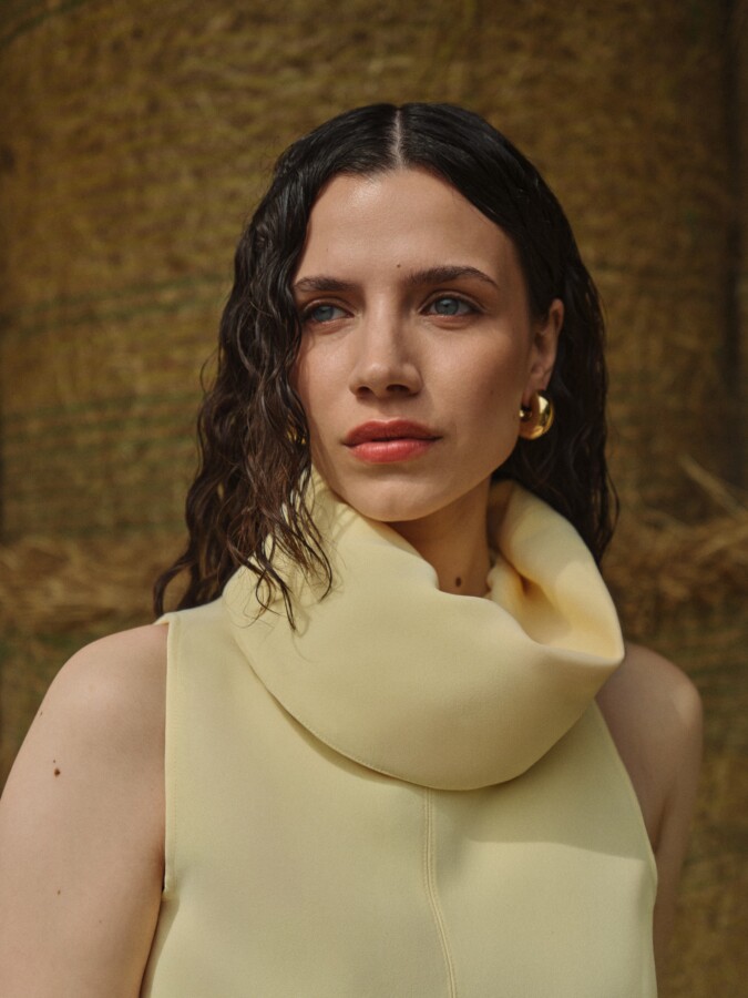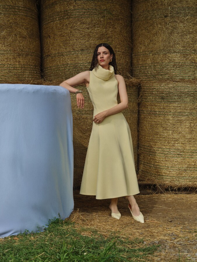 Obleka: Jacquemus, nakit: golden bumble bee, salonarji: Bottega Veneta