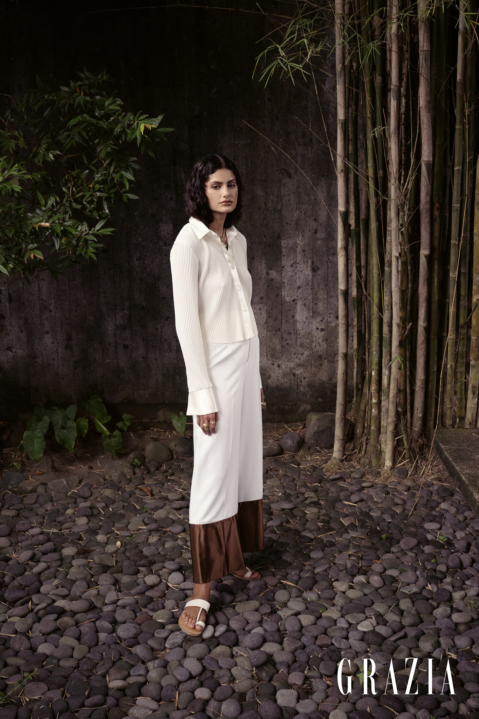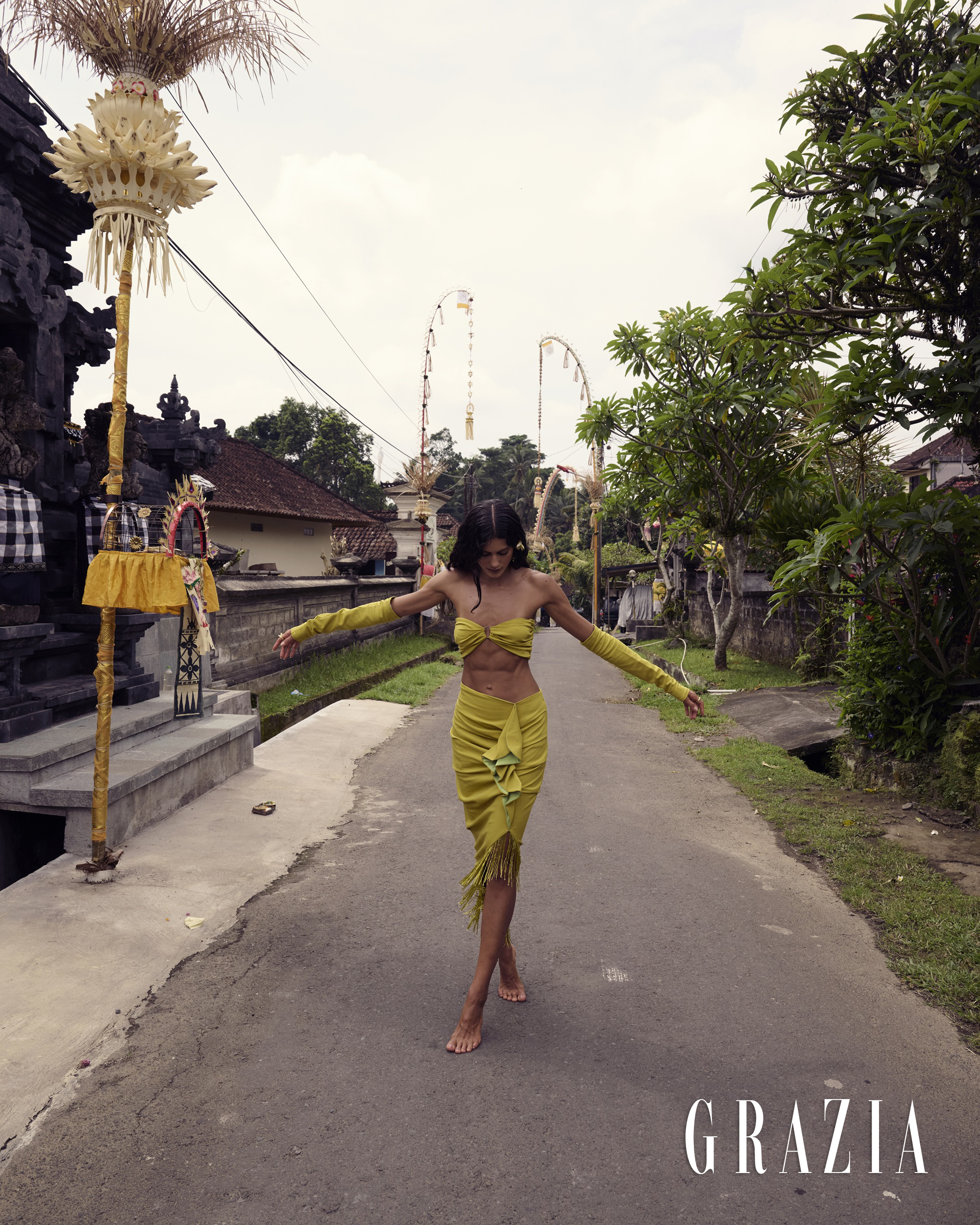V središču zgodbe je znamka IMAGERY, avstralska modna hiša, katere kiparske silhuete in tekoči tekstili vzpostavljajo prepričljivo ravnovesje med minimalizmom in taktilno prisotnostjo. Kosi se gibljejo skupaj z grobimi teksturami pokrajine ter odmevajo tiho geometrijo riževih teras in bogato paleto soncem obsijanih tonov. Naj gre za plapolajoče forme ob mahovnatem obzorju ali arhitekturne linije, omehčane z naravno svetlobo — delo znamke IMAGERY govori o modi, ki je tako premišljena v obliki kot v razpoloženju.