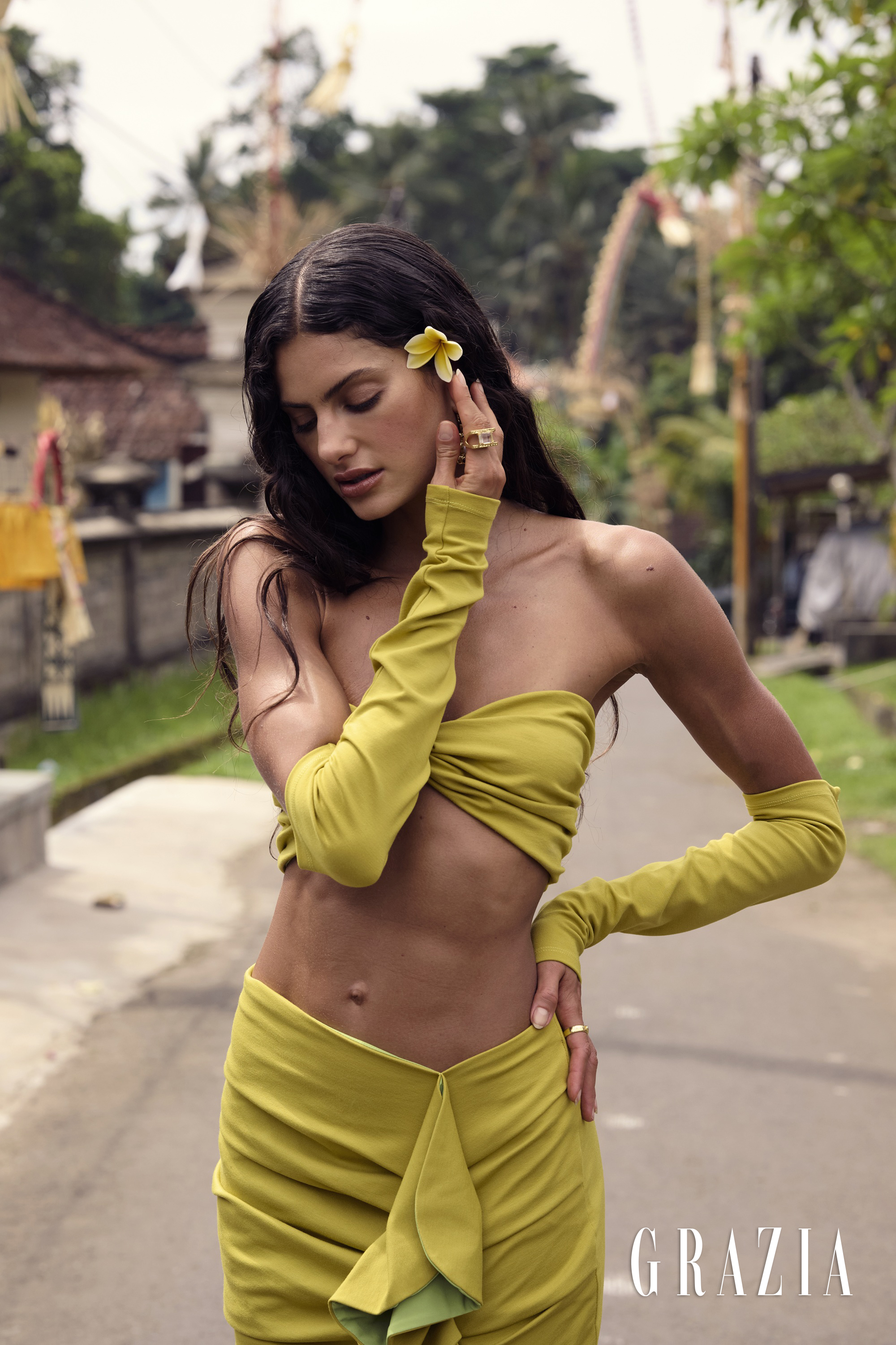 At the heart of the story is IMAGERY, an Australian label whose sculptural silhouettes and fluid textiles strike a compelling balance between minimalism and tactile presence. The pieces move with the landscape’s raw textures, echoing the rice terraces’ quiet geometry and the rich palette of sun-washed tones. Whether it’s billowing forms against a mossy horizon or architectural lines softened by natural light, IMAGERY’s work speaks to fashion that is as thoughtful in form as it is in mood.