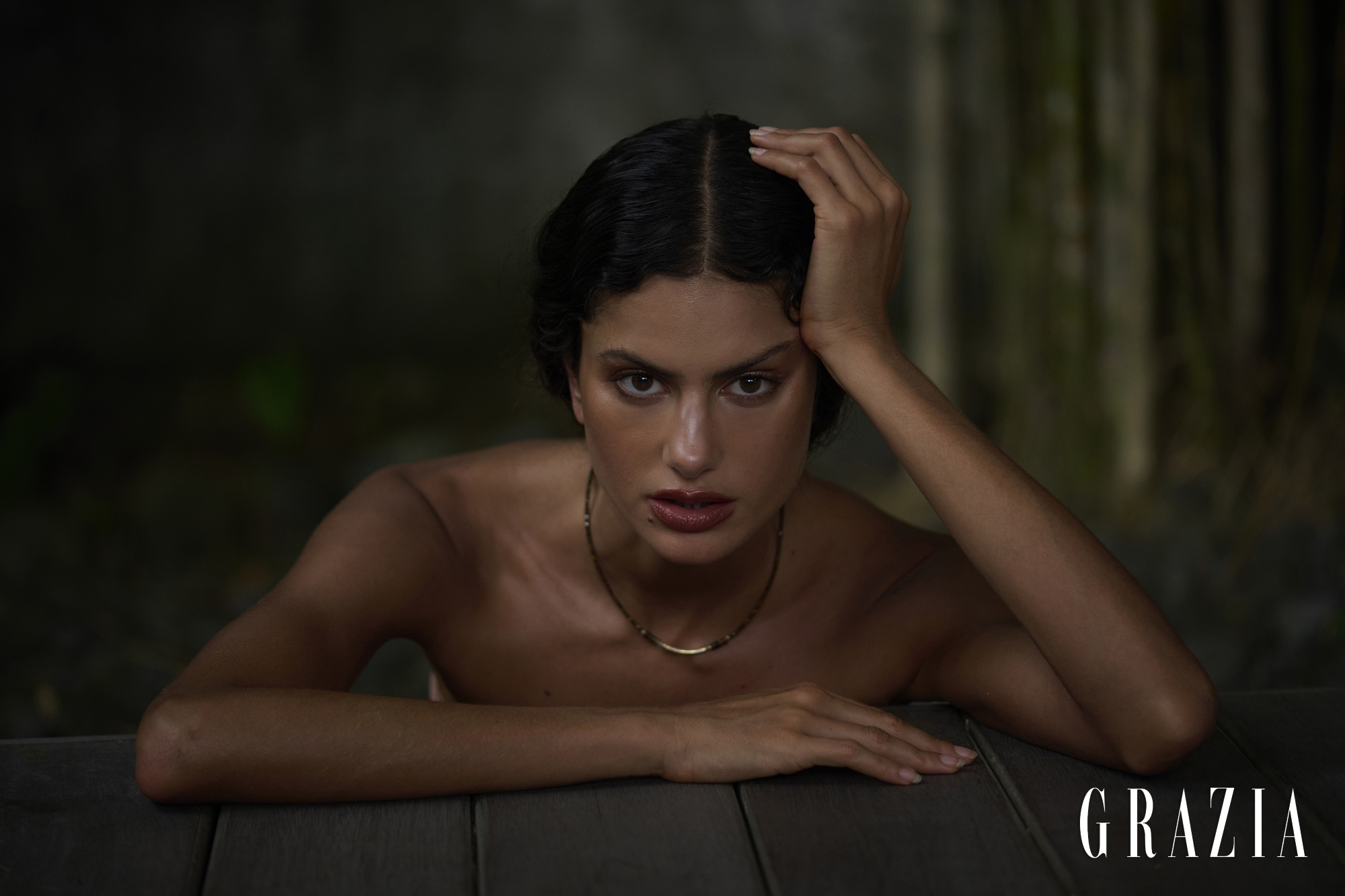 Obleka: Deborah Brider, ogrlica: Petite Grand, videz: Tom Ford Beauty