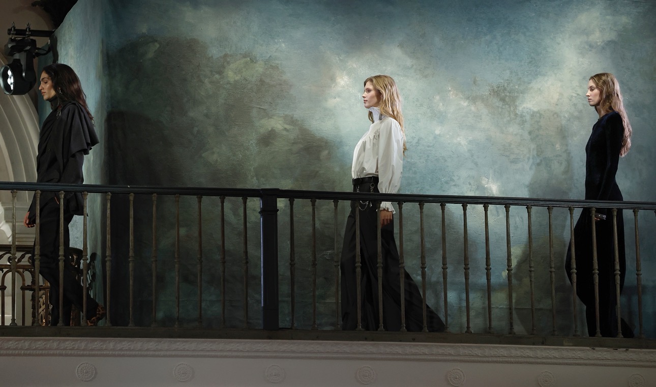 Dogodek je potekal v ikonični stavbi Clock Tower na Manhattnu, kjer se je galerija Jack Shainman za eno noč preobrazila v sanjsko podobo angleškega podeželja. Ročno poslikana pastoralna platna so krasila stene, tla so prekrivale starinske preproge, gostje – med njimi Anne Hathaway, Lana Del Rey in Lili Reinhart, pa so sedeli na stolih v viktorijanskem slogu, medtem ko so modeli samozavestno korakali mimo.