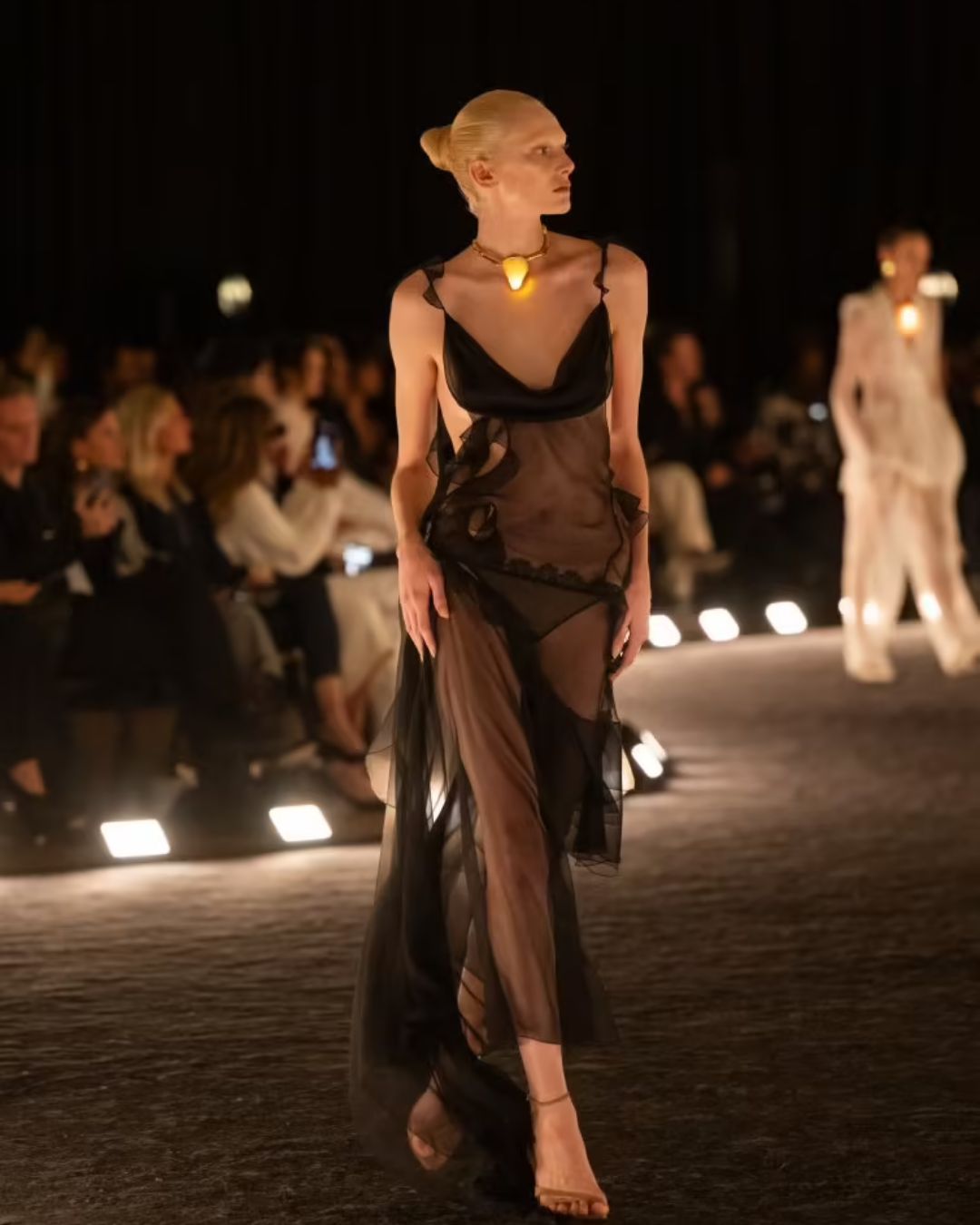Fluidnost: dolge, elegantne obleke s stebričnimi silhuetami, včasih skoraj popolnoma prozorne.