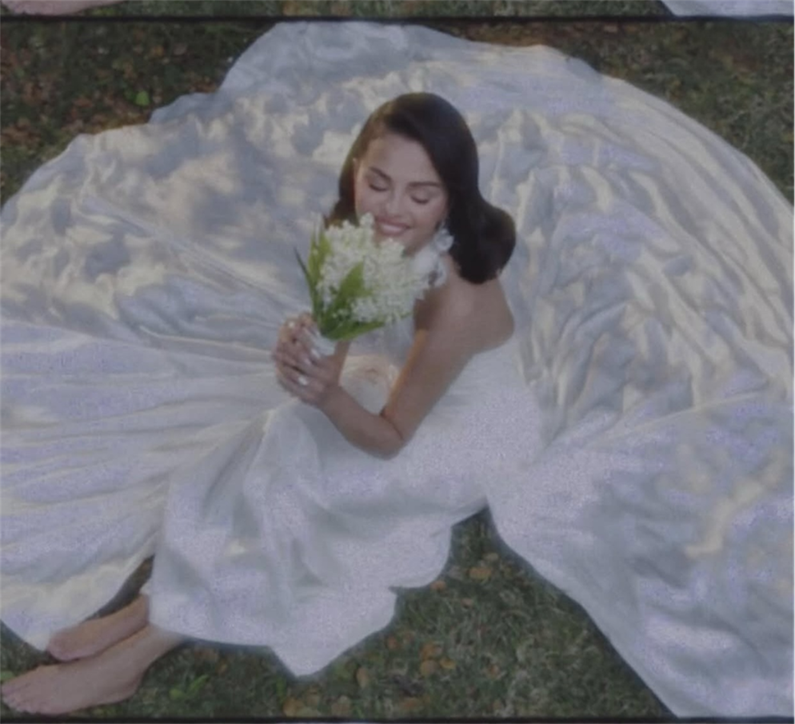Selena se je odločila za satenasto obleko z ovratnikom po meri, ki jo je oblikoval Ralph Lauren, nežen makeup in pričesko ter šopek šmarnic.