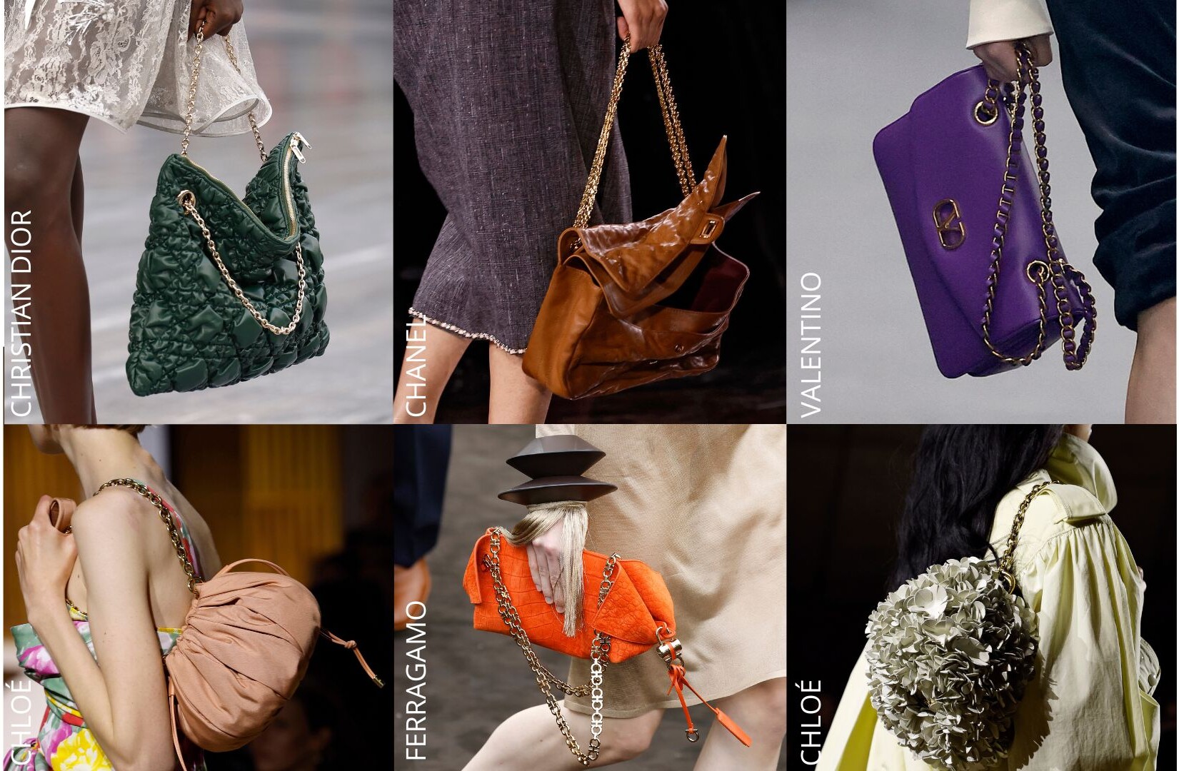 Verižne torbice so se skozi leta pojavljale in izstopale iz glavnega toka modnih trendov. Seveda so bile pri Chanelu osrednje oblikovalsko načelo že skoraj 100 let, toda vzpon “tihega razkošja” je naredil prostor za torbice z malo ali nič strojne opreme. Pomlad/poletje 2026 je dodatke z verižnimi ročaji vrnilo na zemljevid v velikem slogu! Z novimi različicami, ki sedaj segajo tako v dnevne kot večerne sloge. Chloé modeli torbic iz zmečkanega usnja so nosili na rami, Ferragamo je predstavil teksturirano torbico v barvi mandarin z verižico iz prepletenega logotipa Gancini, pri Givenchyju pa je Sarah Burton razkrila cevaste torbice z verižnimi ročaji, okrašenimi z obeski.