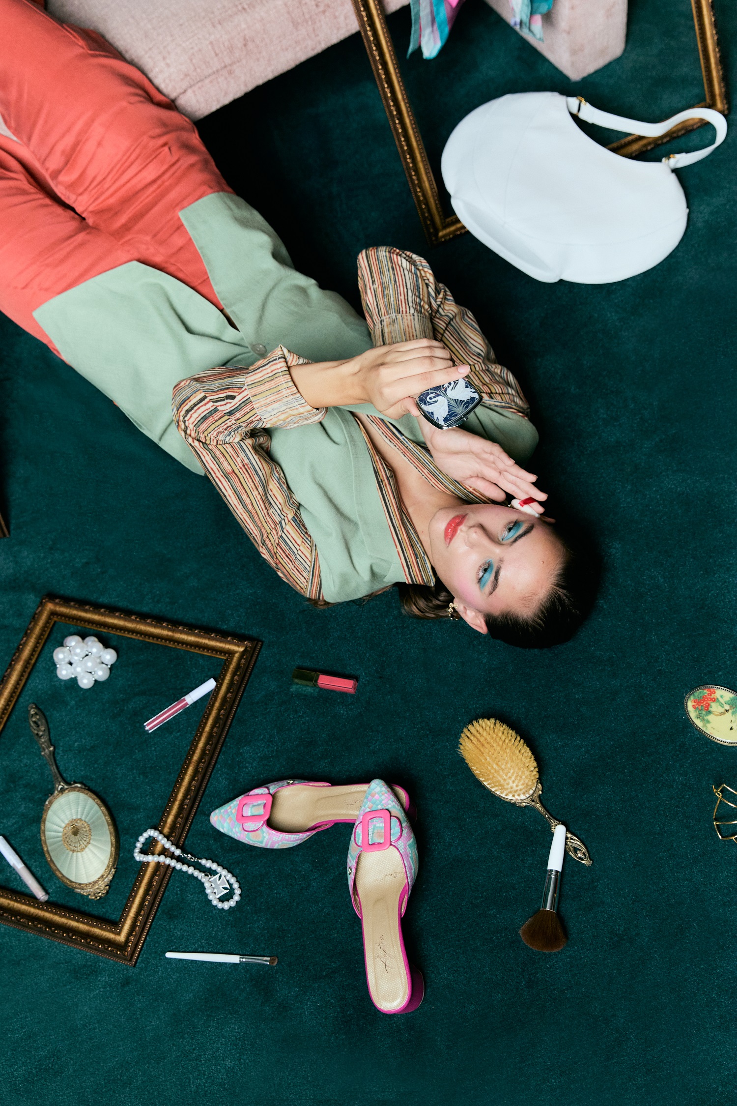Brezrokavnik LILI BLANC (@liliblancofficial), suknjič JIWYA (@jiwyaofficial), hlače LIZ SKORSIS (@liz_skorsis), uhani LNB JEWELLERY (@jewellerybarstore) in ostali dodatki na tleh: salonarji AGATHA DESIGNS (@agathadesigns.us), torbica MADE IN NEPTUNE (@madeinneptune_), biserna ogrlica SOLOMEINA (@solomeinajewelry), ogrlica LNB JEWELLERY (@jewellerybarstore)