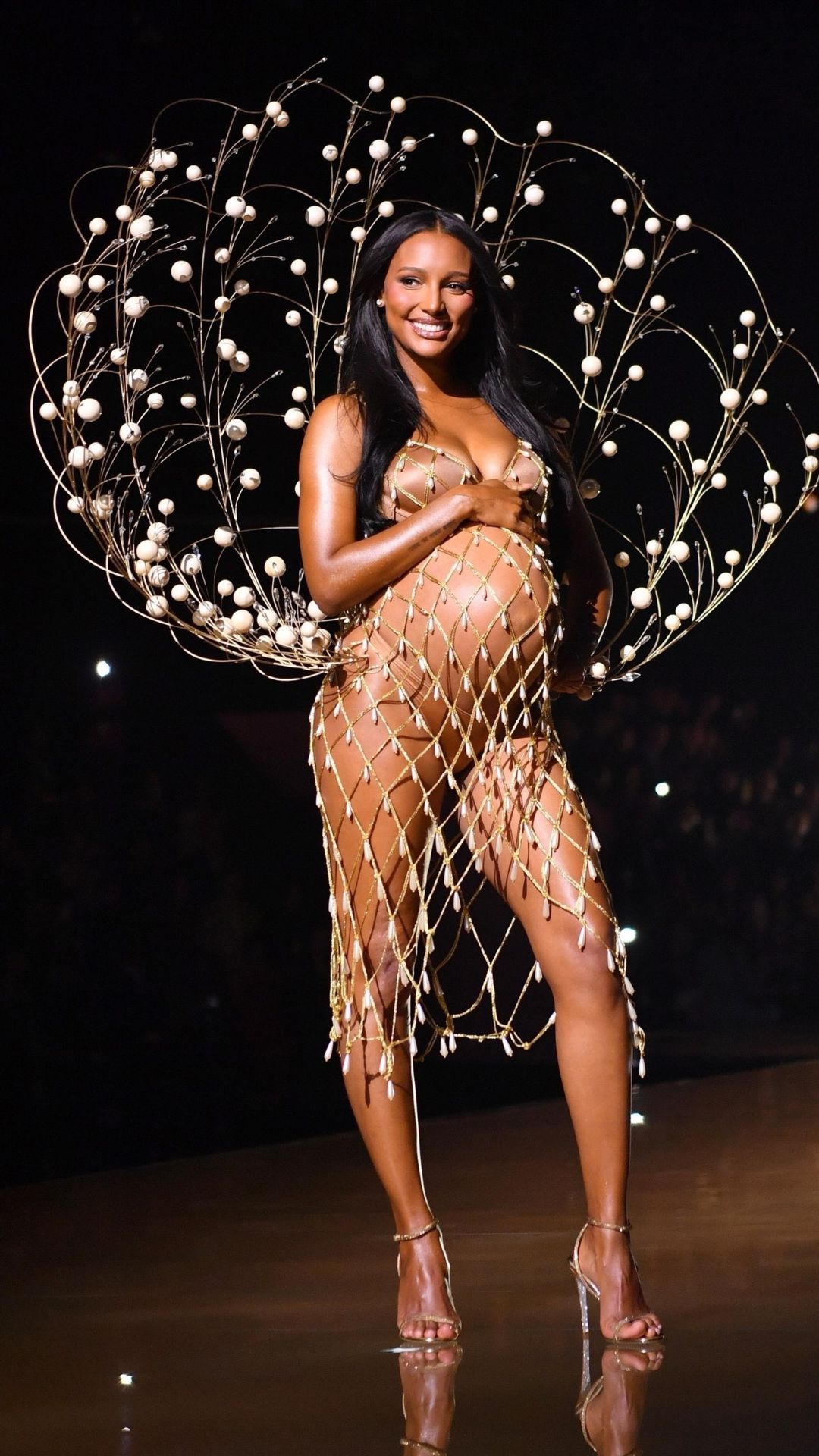 Kalifornijska manekenka Jasmine Tookes, ki je trenutno v devetem mesecu nosečnosti, je modno revijo odprla v sijočem slogu! Njen videz je sestavljala mrežasta obleka iz zlate tkanine z mrežastim vzorcem in dragulji v obliki solz, ki so viseli s križišč. Namesto kril je Jasmine nosila Botticellijevo kletko v obliki školjke, ki je spominjala na veličasten plašč, okrašen z vejicami podobnimi žicami, na vrhu okrašenimi z bisernimi čebulicami. Na koncu je videz zaokrožila z ujemajočimi se kovinskimi sandali s peto.